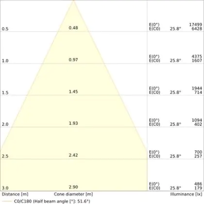 De gradenbundel geeft informatie over hoe breed het licht wordt uitgestraald. Dit zit tussen de 0 en 360 graden (D). Hoe kleiner de hoek, hoe specifieker de lichtbundel is. Over het algemeen is een smalle gradenbundel perfect voor sfeer- of accentverlichting, terwijl een brede gradenbundel ideaal is om grote oppervlaktes te verlichten.