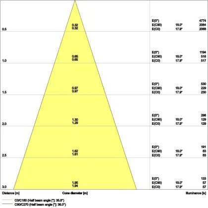 De lichtopbrengst en de gradenbundel spelen een grote rol. Zo geeft de lichtopbrengst van 640 Lumen in combinatie met de 36° stralingshoek deze inbouwspot een specifieke toepassing. Kort samengevat is een lichtintensiteit van maximaal 400 Lumen ideaal voor accentverlichting, terwijl hogere waardes goed gebruikt kunnen worden als basisverlichting. Over het algemeen geldt: hoe breder de gradenbundel, hoe geschikter deze is door basisverlichting. Dit komt doordat het licht over een groter oppervlak wordt verspreid. Smallere gradenbundels (tot 40°) kunnen echter bij hoge plafonds ook goed tot hun recht komen als algemene verlichting.