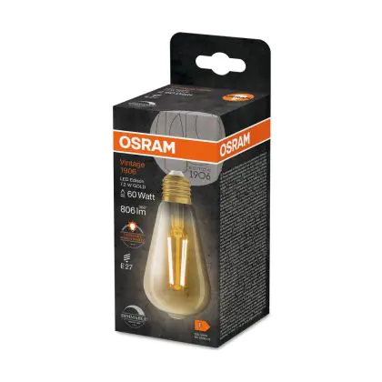 Beschrijving Osram Vintage 1906 LED E27 Edison Filament Goud 7.2W 806lm - 824 Zeer Warm Wit | Vervangt 60W