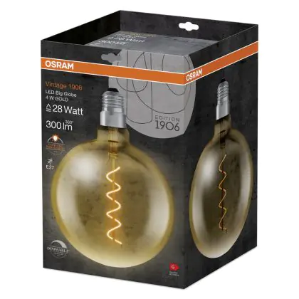 Deze bolvormige en stijlvolle LED gloeilamp uit de welbekende Osram Vintage 1906 serie voorziet elke ruimte van sfeer en gezelligheid. Het goud gekleurde glas en de sierlijke kooldraad met daarin hoogwaardige kwaliteit LED’s zorgen voor een schitterend contrast qua licht en is het aanzien meer dan waard! Laat iedereen versteld staan van de warme tint die deze Osram vintage LED lamp creëert.